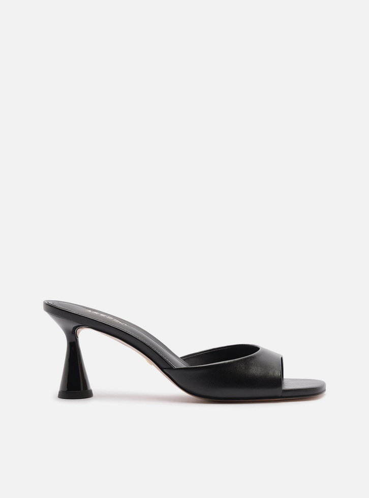 Mule preta de couro. O sapato tem salto baixo em formato taça e formato quadrado na ponta. Traz tira única sobre os dedos, mais larga nas laterais. Com palmilha preta e inscrição do nome da marca.