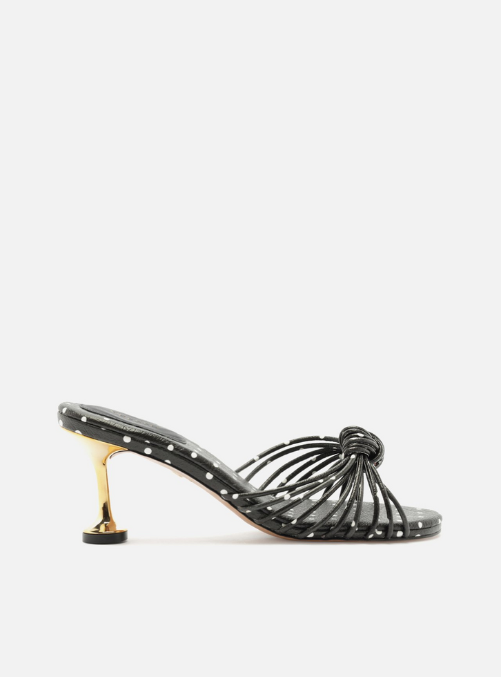 Mule feminina preta com estampa poá branca. O sapato tem salto médio taça metálico dourado e formato arredondado na ponta. Possui tiras finas sobre os dedos, unidas por nó central. Com palmilha na estampa do sapato e tag com o nome da marca.