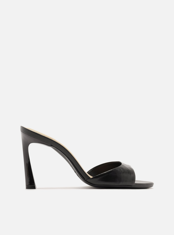 Sandália feminina preta. O sapato tem salto alto fino e formato folha na ponta. Traz tira média sobre os dedos. Aberta, com palmilha bege e inscrição do nome da marca.