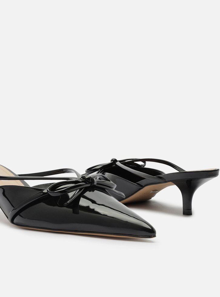 Mule feminina preta com acabamento envernizado. O sapato tem salto baixo fino e ponta fina. Traz cabedal fechado com recorte em V, tira fina e aplicação de laço. Possui mais uma tira fina em V na parte superior do pé. Com palmilha bege e inscrição do nome da marca. Exibe a parte superior do pé e o calcanhar.
