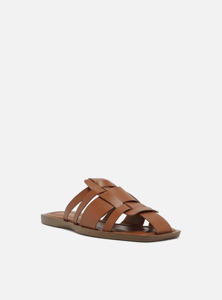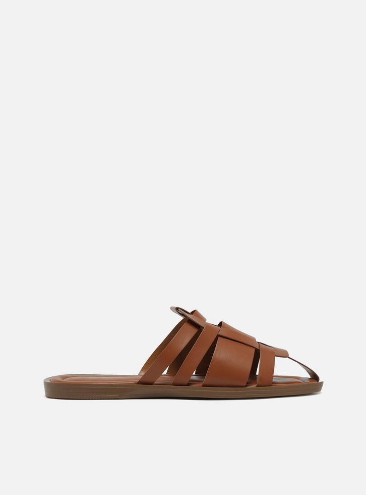 Mule Marrom. O modelo tem salto rasteiro, base emborrachada preta e bico quadrado. Traz tiras grossas no cabedal, cobrindo parte dos dedos e do peito do pé, sendo uma maior central e as demais horizontais, todas entrelaçadas. Aberta no calcanhar, possui palmilha da cor do modelo com costura bombada marcada e inscrição do nome da marca. A mule exibe parte do pé.