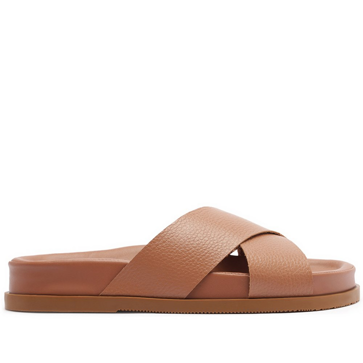 Papete Nina de tiras cruzadas, na cor marrom. O modelo apresenta cabedal em material similar ao couro. Possui cabedal em tiras que se cruzam em design de X sobre os dedos e sobre o peito de pé. Aberta atrás, vem com solado rasteiro, emborrachado e levemente tratorado, com palmilha anatômica no mesmo tom da papete e assinatura Anacapri.
