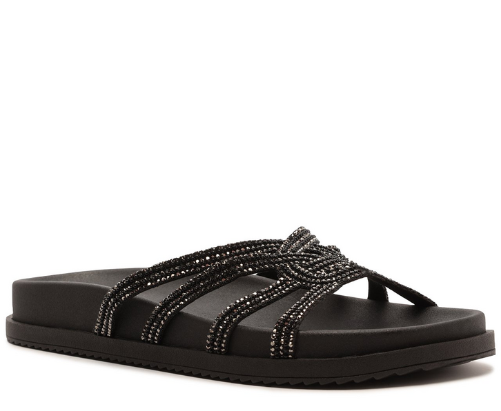 Papete anatômica glam de tiras entrelaçadas, na cor preta. Possui cabedal com tiras sobre os dedos, que se cruzam e se conectam ao centro, com design de elo. Com detalhe glam nas tiras, em manta suede brilhosa. Com solado rasteiro emborrachado e levemente tratorado, traz palmilha anatômica, com assinatura Anacapri.