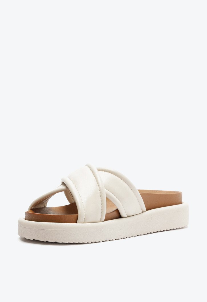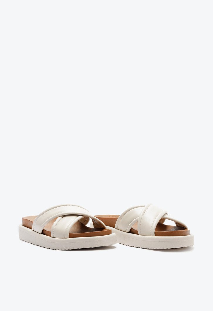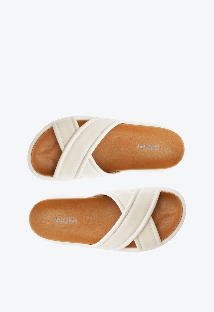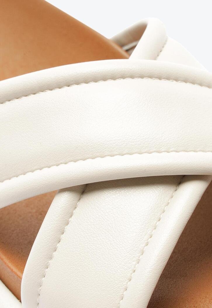 Papete Anacapri branca de tiras cruzadas, com detalhe em pespontos . O modelo possui cabedal com duas tiras grossas de material similar ao couro stretch, contornadas em pesponto de mesmo tom - que se cruzam sobre os dedos e peito de pé. Apresenta solado emborrachado tratorado branco e palmilha anatômica marrom, com assinatura Anacapri. Aberta, o modelo exibe todo o pé.