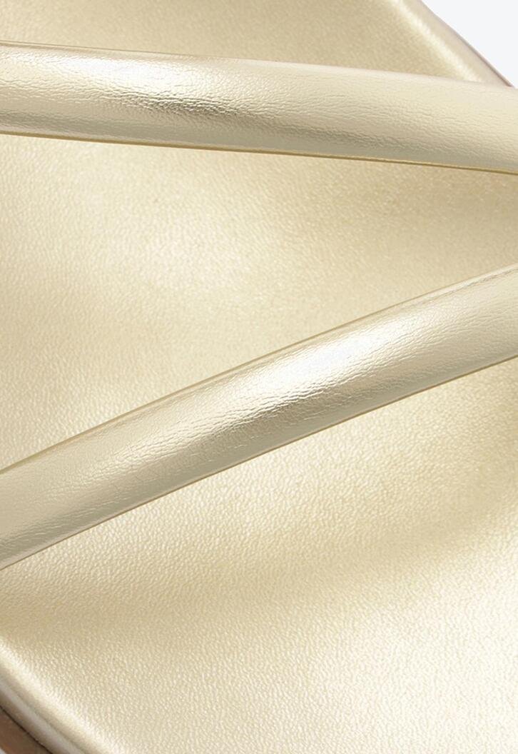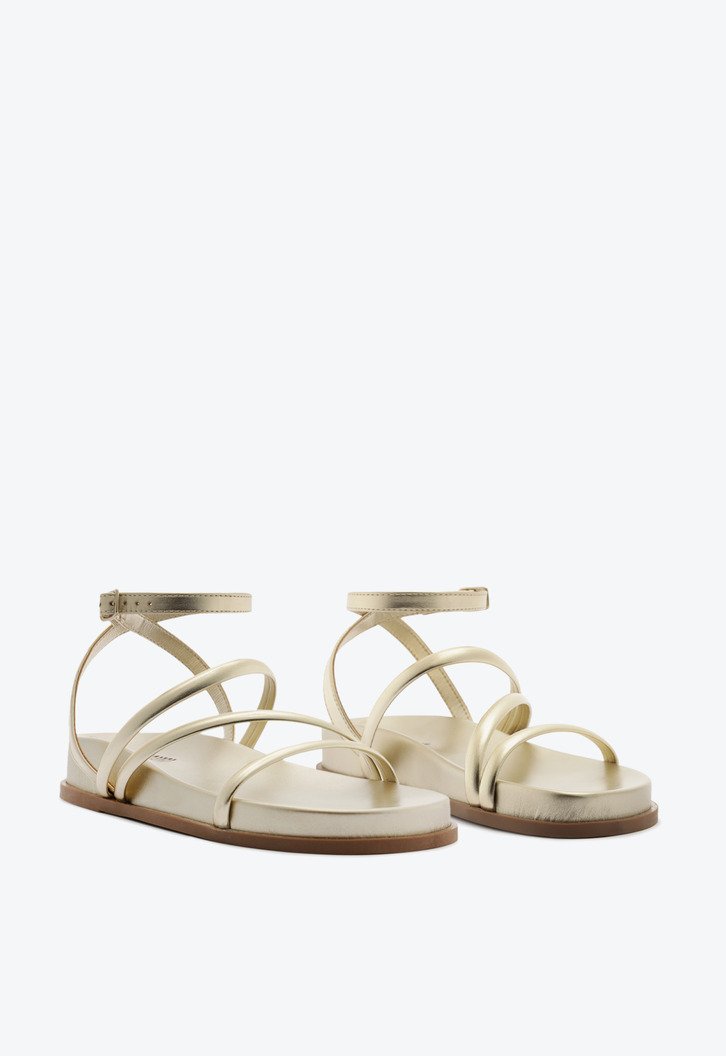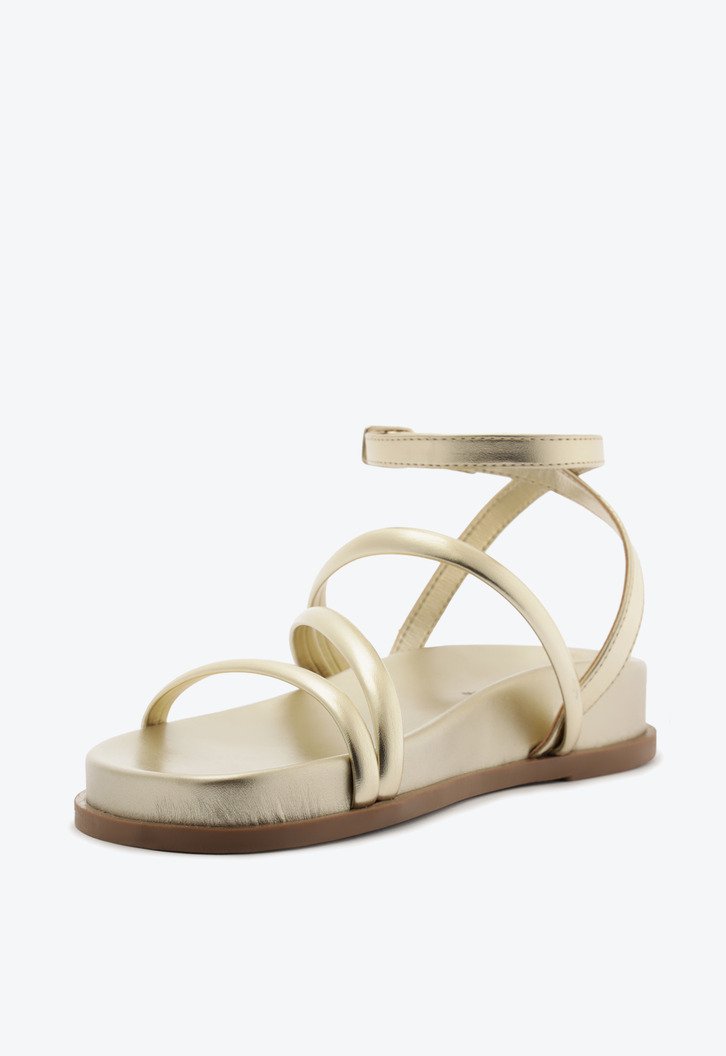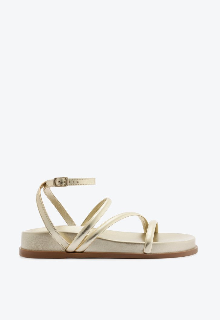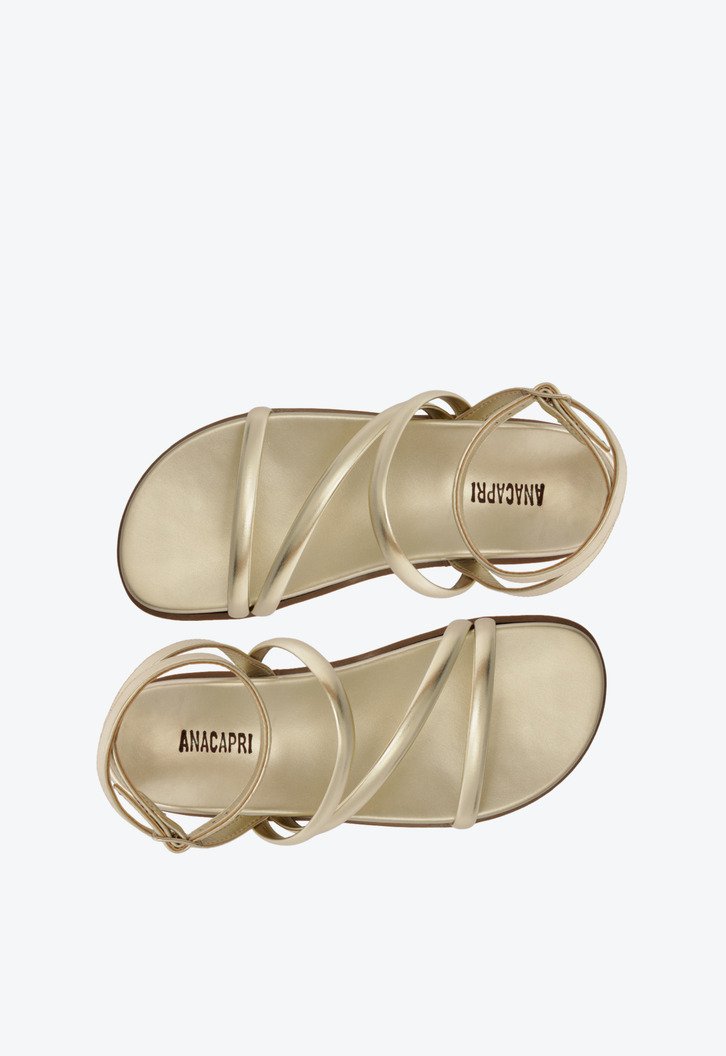Papete anatômica de tiras assimétricas, na cor dourada. O modelo possui solado rasteiro emborrachado e biqueira arredondada. Apresenta cabedal em trio de tirinhas bombadas assimétricas - uma sobre os dedos, outra transpassada e outra sobre o peito de pé. Traz tiras laterais traseiras que contornam o calcanhar e se conectam à tira que abraça o tornozelo, com fecho superior em fivela lateral.Traz palmilha anatômica com assinatura Anacapri. Aberta, deixa os dedos e calcanhar totalmente à mostra.