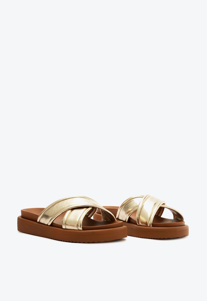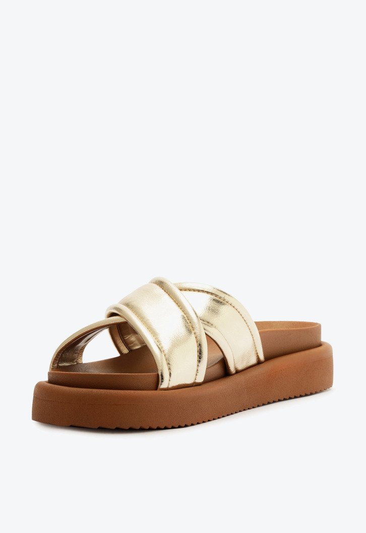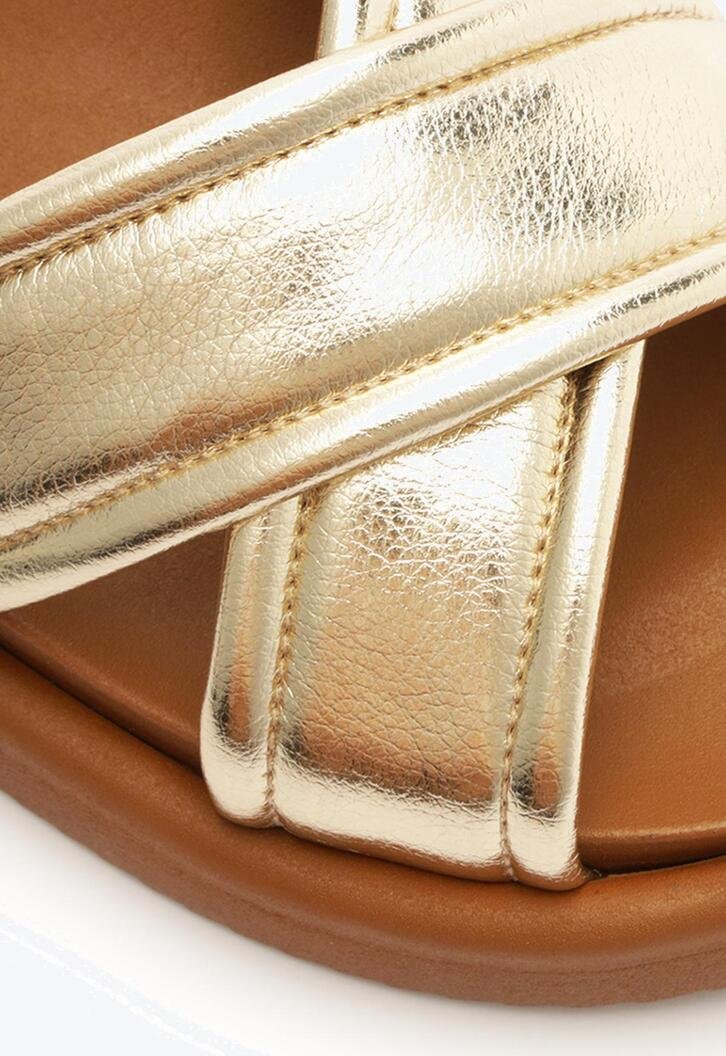 Papete Anacapri dourada de tiras cruzadas, com detalhe em pespontos . O modelo possui cabedal com duas tiras grossas de material similar ao couro stretch, contornadas em pesponto de mesmo tom - que se cruzam sobre os dedos e peito de pé. Apresenta solado emborrachado tratorado e palmilha anatômica marrom, com assinatura Anacapri. Aberta, o modelo exibe todo o pé.