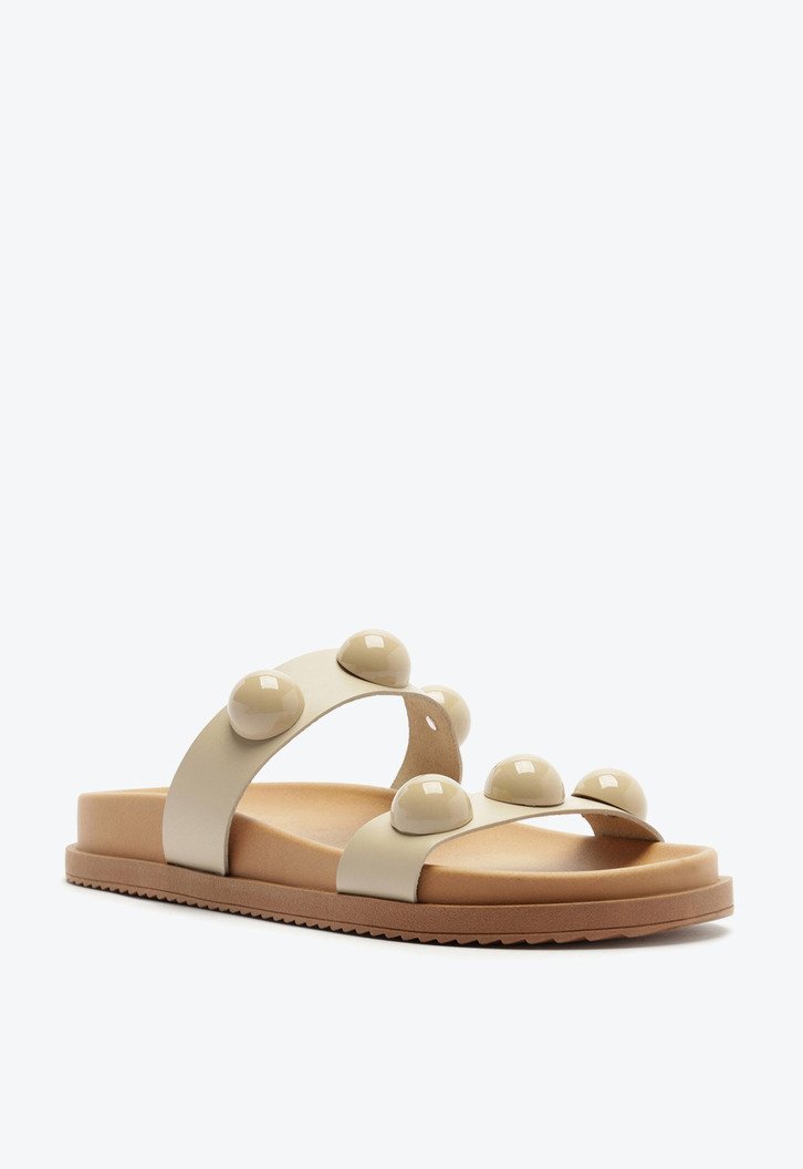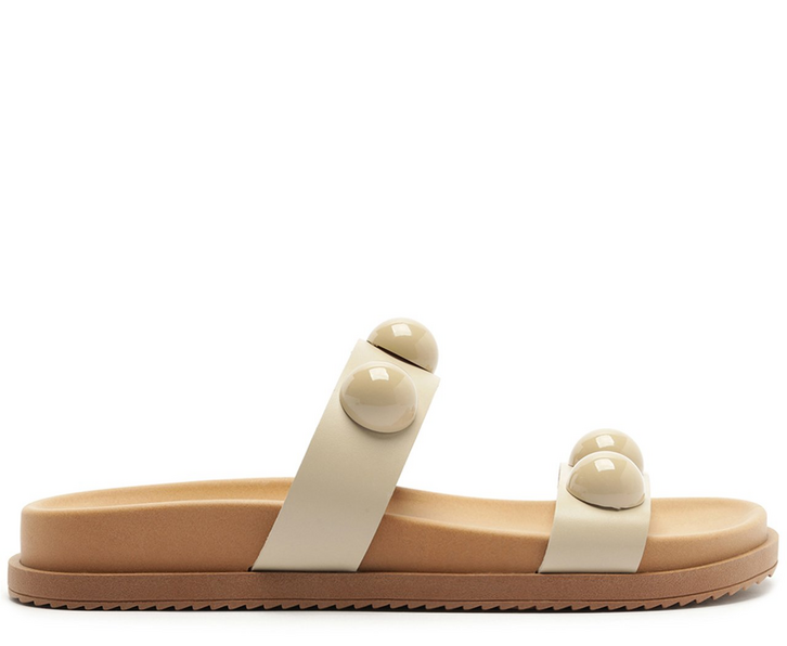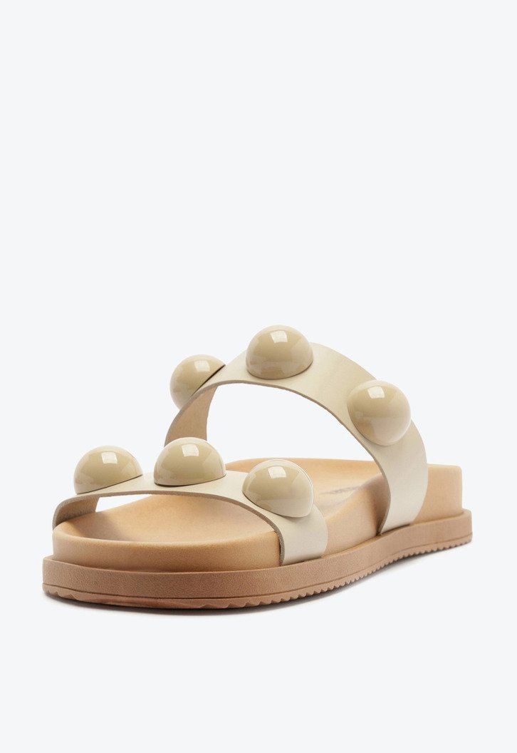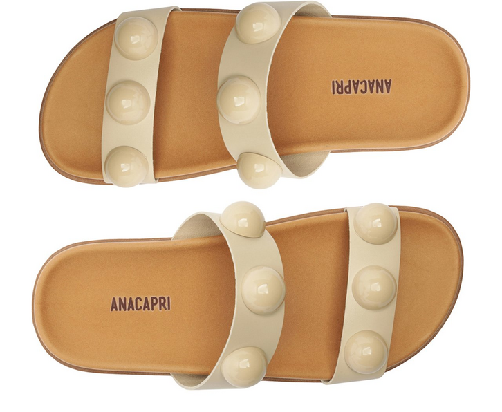 Papete anatômica com duas tiras e detalhe em esferas, na cor nude. O modelo apresenta cabedal em couro com duas tiras largas - uma sobre os dedos, outra sobre o peito de pé, com detalhe para aplicação de trio de maxi esferas, do mesmo tom da papete, em cada uma das tiras. Com solado rasteiro emborrachado e levemente tratorado, traz palmilha anatômica, com assinatura Anacapri.