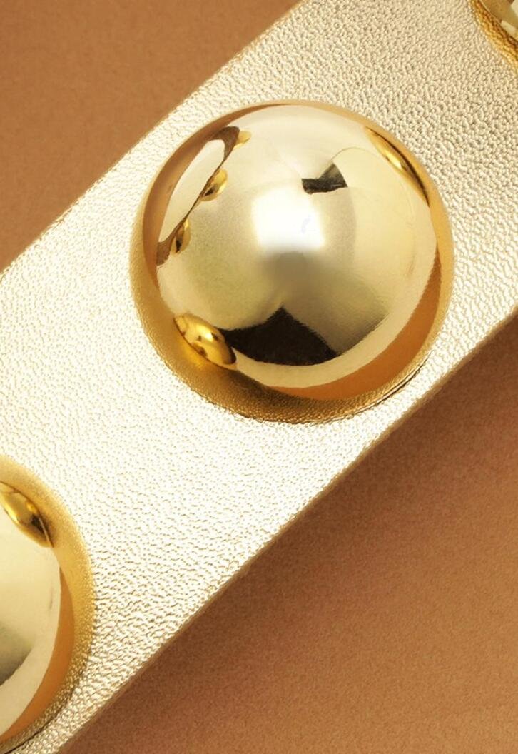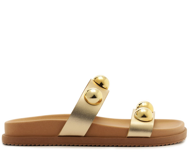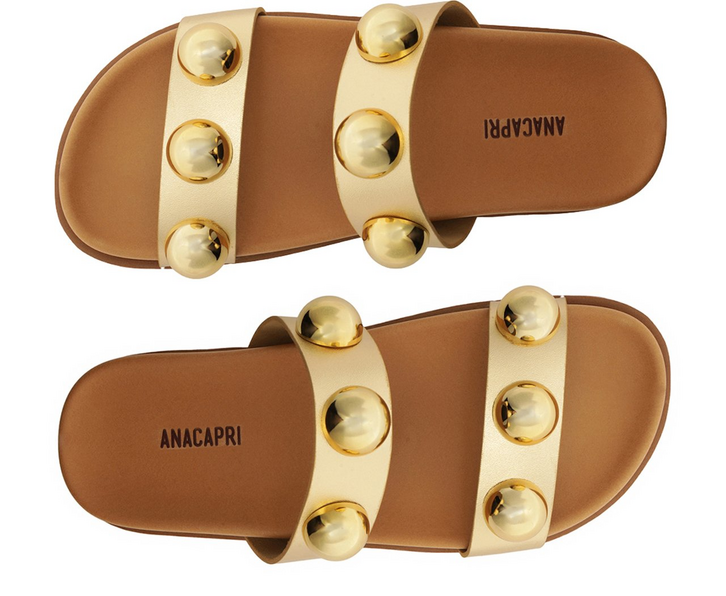 Papete anatômica com duas tiras e detalhe em esferas, na cor dourada. O modelo apresenta cabedal em couro com duas tiras largas - uma sobre os dedos, outra sobre o peito de pé, com detalhe para aplicação de trio de maxi esferas, do mesmo tom da papete, em cada uma das tiras. Com solado rasteiro emborrachado e levemente tratorado, traz palmilha anatômica, com assinatura Anacapri.