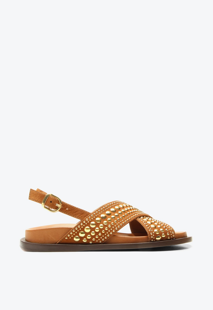 Papete Minnesota caramelo em nobuck. Um modelo que combina conforto e estilo com tiras decoradas por studs metalizados que trazem um toque de glow e personalidade ao visual. Leve e versátil, é ideal para valorizar produções de verão, deixando qualquer look mais atual e estiloso.