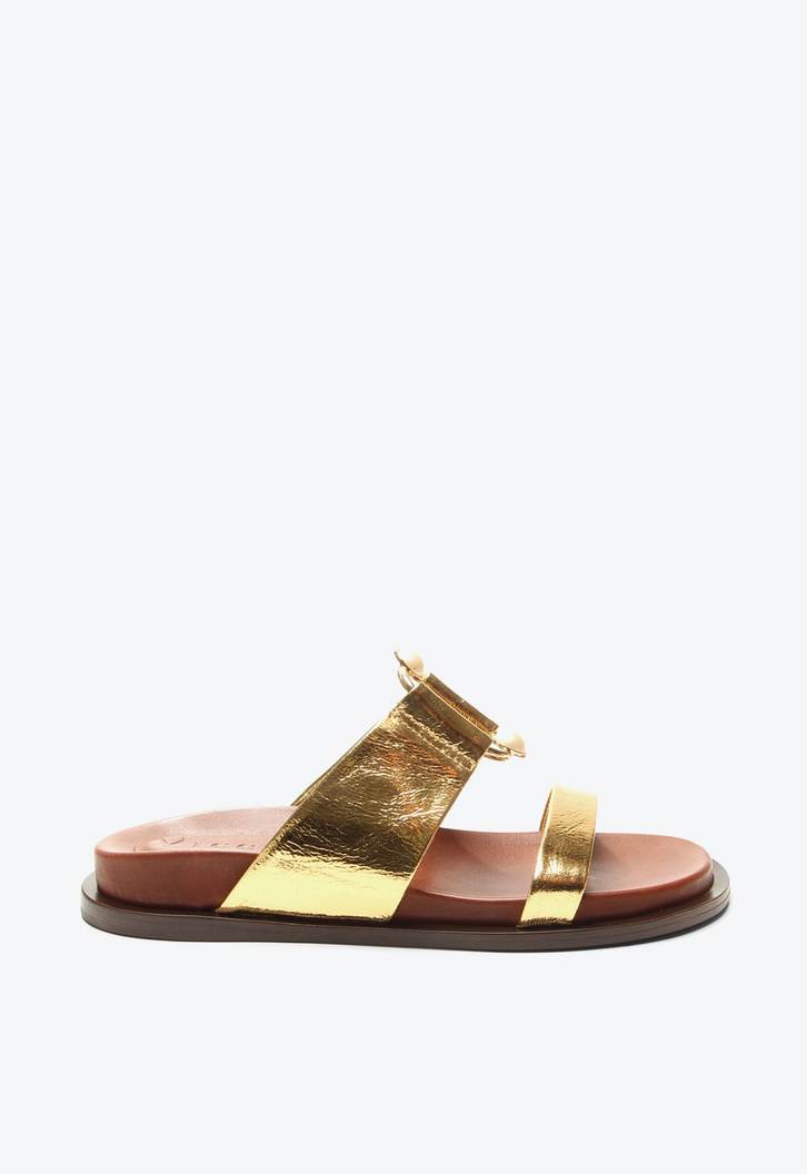 Papete Minnesota Dourado é simplicidade refinada com um toque de brilho. Em couro metalizado, traz tiras largas de design clean e detalhe em argola com aplicações peroladas que elevam o visual. Confortável e funcional, conta com palmilha forrada e solado baixo para acompanhar a rotina com leveza. Uma peça-chave, ideal para compor looks versáteis com modernidade e elegância.