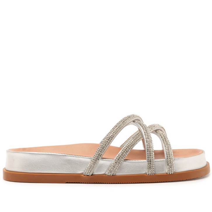 Papete glam de tiras entrelaçadas, na cor prateada. O modelo robusto e imponente apresenta cabedal com tirinhas finas - com detalhe glam em manta brilhosa - que se cruzam sobre os dedos e peito de pé. De biqueira arredondada, o modelo é aberto e exibe todo o pé. Apresenta solado emborrachado com leve tratorado e palmilha anatômica, com assinatura Anacapri.