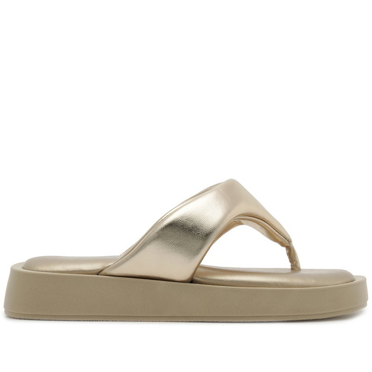 Papete Nina, na cor dourada. O modelo de material similar ao couro traz biqueira moderna quadrada. De salto flatform baixo, possui cabedal com tira única e central mais larga - com efeito acolchoado na gáspea e design triangular, que separa os dedos. Aberta atrás, a papete possui palmilha acolchoada com assinatura Anacapri.