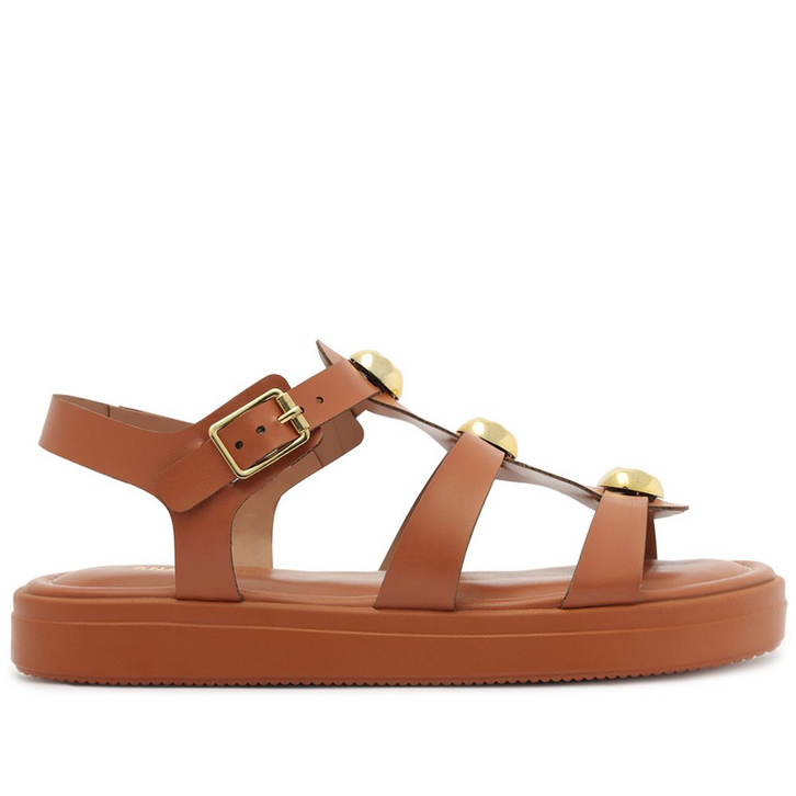 Papete plataforma, com aplicação de adornos, na cor marrom. O modelo possui salto flatform alto e biqueira arredondada. Traz cabedal em trio de tiras com design de recorte - uma sobre os dedos, outra sobre o peito de pé e uma central - que se conectam entre si, com detalhe para aplicação de adornos metálicos imponentes. Possui tira traseira que contorna o calcanhar, conectada em tira afivelada, com fecho no tornozelo. Possui palmilha acolchoada comfy, no mesmo tom da papete e assinatura Anacapri.
