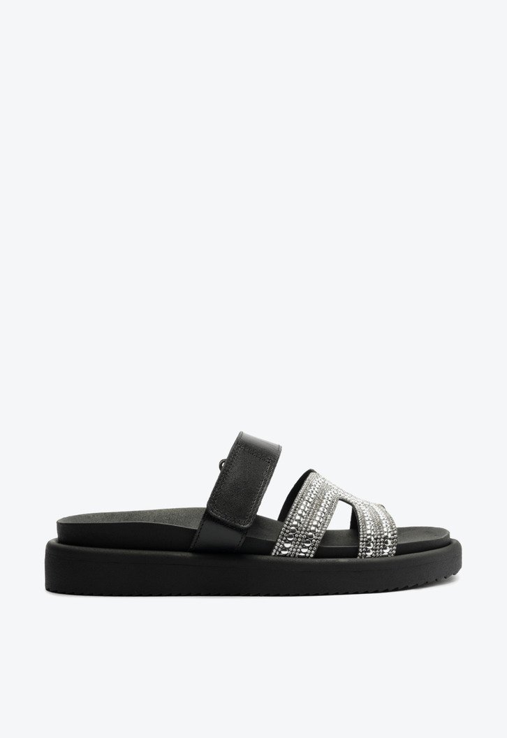 Papete de tira em H com aplicação de strass, na cor preta. O modelo apresenta cabedal com tira larga com design em H, trazendo recortes vazados sobre os dedos, com aplicação de manta de brilho com strass. Traz também uma tira larga preta com fecho lateral ajustável em velcro, sobre o peito de pé. De biqueira arredondada, o modelo é aberto e exibe todo o pé. Apresenta solado emborrachado tratorado e palmilha anatômica de mesmo tom da papete , com assinatura Anacapri.