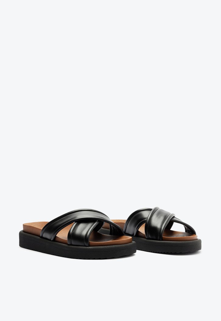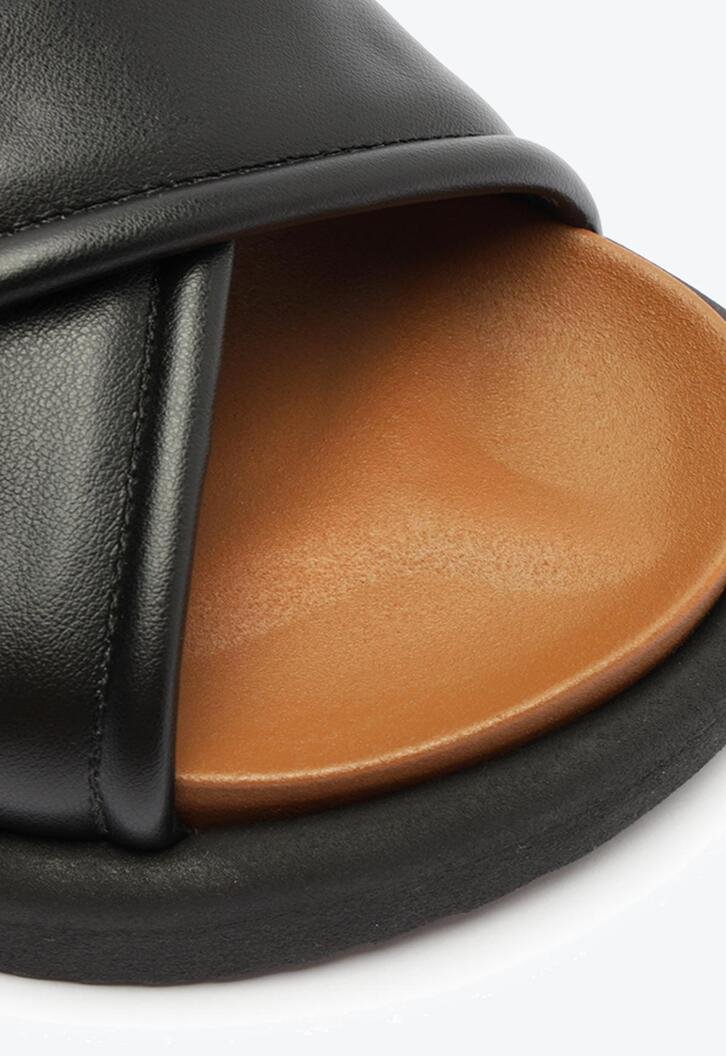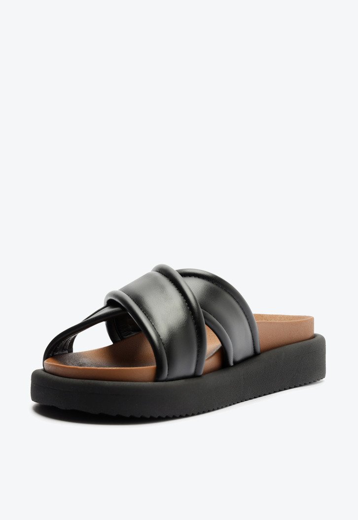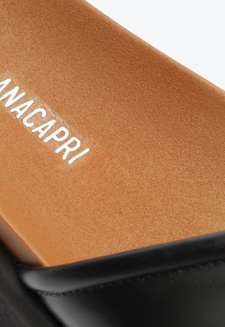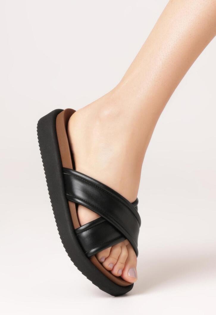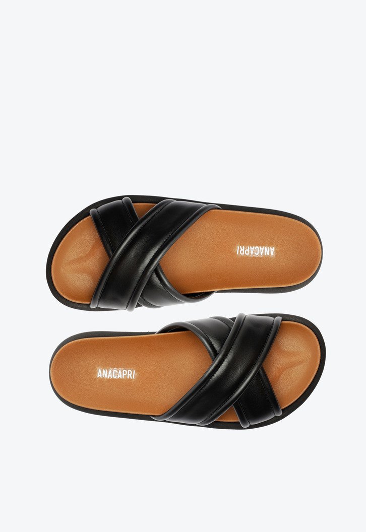 Papete Anacapri preta de tiras cruzadas, com detalhe em pespontos . O modelo possui cabedal com duas tiras grossas de material similar ao couro stretch, contornadas em pesponto de mesmo tom - que se cruzam sobre os dedos e peito de pé. Apresenta solado emborrachado tratorado preto e palmilha anatômica marrom, com assinatura Anacapri. Aberta, o modelo exibe todo o pé.