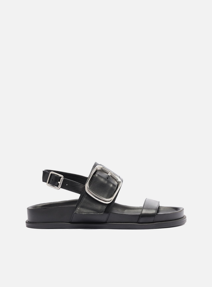 Papete em couro preto com acabamento em bico redondo. O modelo conta com tiras largas que deixam o pé à mostra, além de fivela metálica dourada que adiciona um toque de sofisticação. Confortável e versátil, é perfeita para compor produções leves e modernas.