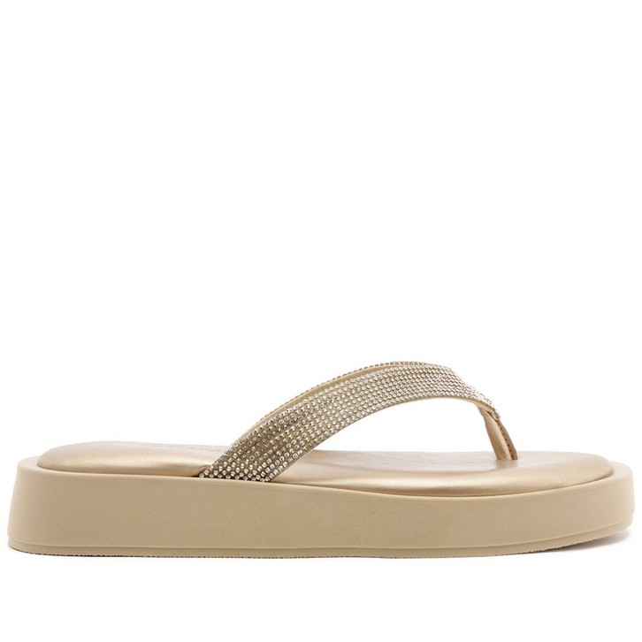Papete de tira glam, na cor dourada. O modelo de material similar ao couro traz biqueira moderna quadrada. De salto flatform baixo, possui cabedal com tira única e central fina - com detalhe glam em manta suede brilhosa - com design triangular na gáspea, que separa os dedos. Aberta atrás, a papete possui palmilha acolchoada, com assinatura Anacapri em carimbo metálico.