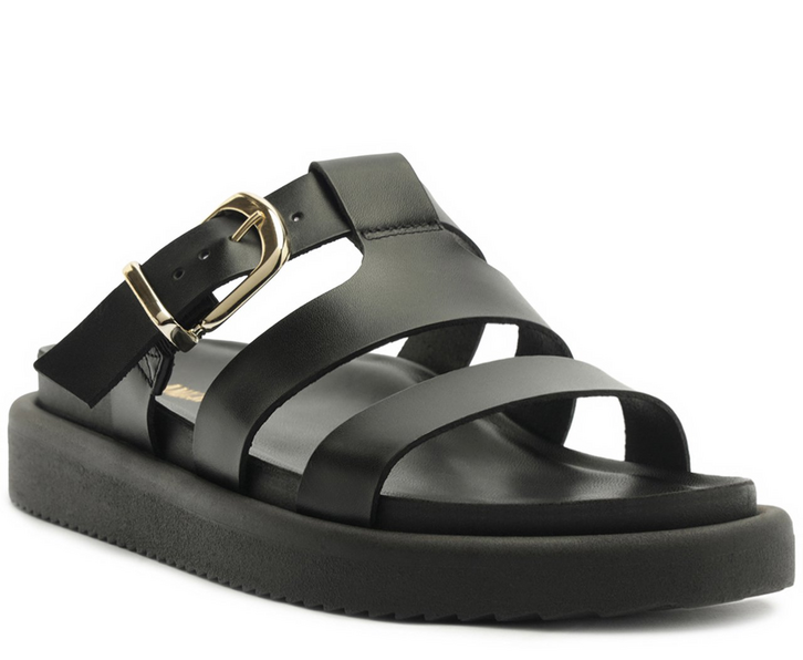 Papete de tiras em couro, com detalhe em fivela, na cor preta. O modelo apresenta cabedal com trio de tiras mais largas: uma sobre os dedos e as outras duas com detalhe de recortes vazados sobre o peito de pé, com design imponente em H - que se conectam entre si, com aplicação de maxi fivela metálica com regulagem na lateral. De biqueira moderna quadrada, o modelo é aberto e exibe todo o pé. Apresenta solado flatform emborrachado com leve tratorado, com palmilha anatômica no mesmo tom da papete e assinatura Anacapri.