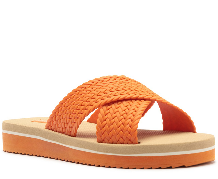 Papete injetada com tiras cruzadas em tressê, na cor laranja. O modelo em EVA injetado, apresenta cabedal com duas tiras mais largas com efeito tressê, cruzadas sobre os dedos e peito de pé. Com solado flatform emborrachado e leve tratorado no mesmo tom da papete, traz palmilha nude com assinatura Anacapri e detalhe em listra branca no contorno do solado.