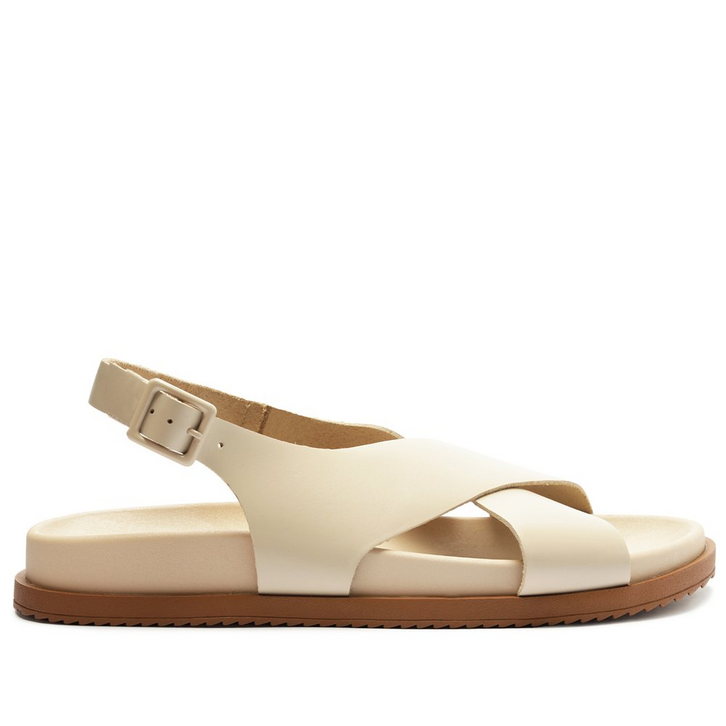 Papete tradicional de tiras cruzadas, na cor bege. O modelo de material similar ao couro traz biqueira arredondada. Possui cabedal com tiras mais largas na gáspea, que se cruzam sobre os dedos e peito de pé - seguindo até a pala e abraçando o tornozelo - contornando o calcanhar, com fecho afivelado na lateral. Apresenta solado rasteiro emborrachado e tratorado, com palmilha anatômica da mesma cor da papete, com assinatura Anacapri.