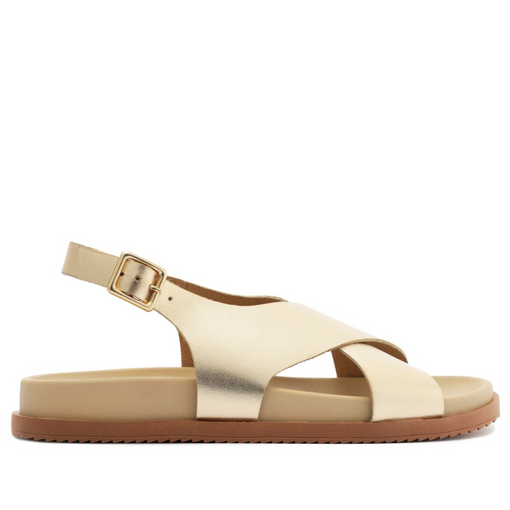 Papete tradicional de tiras cruzadas, na cor dourada. O modelo de material similar ao couro traz biqueira arredondada. Possui cabedal com tiras mais largas na gáspea, que se cruzam sobre os dedos e peito de pé - seguindo até a pala e abraçando o tornozelo - contornando o calcanhar, com fecho afivelado na lateral. Apresenta solado rasteiro emborrachado e tratorado, com palmilha anatômica da mesma cor da papete, com assinatura Anacapri.