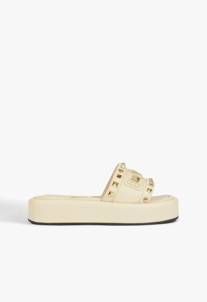 Papete slide feita em couro, com detalhamento em aplicações de tachas douradas.