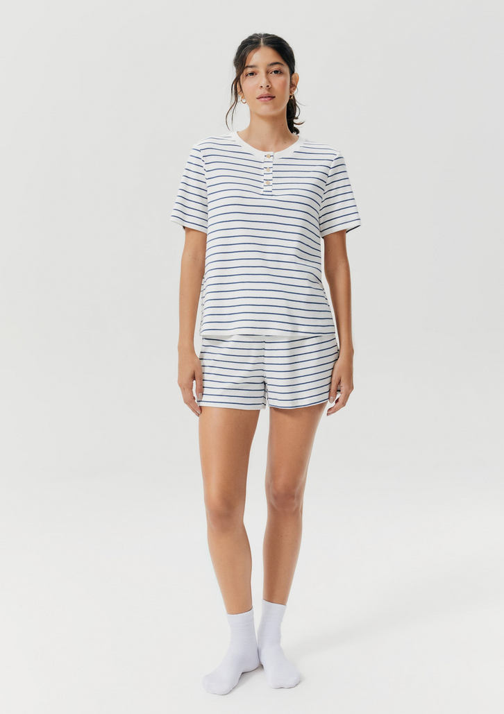 Conjunto feminino de pijama com camiseta manga curta com shorts. Pijama com modelagem comfort e malha de ribana sem canelado de fio tinto com toque super macio. A camiseta possui decote henley que traduz um peitilho curto com gola redonda e botões.Detalhes do conjunto:Em ribana