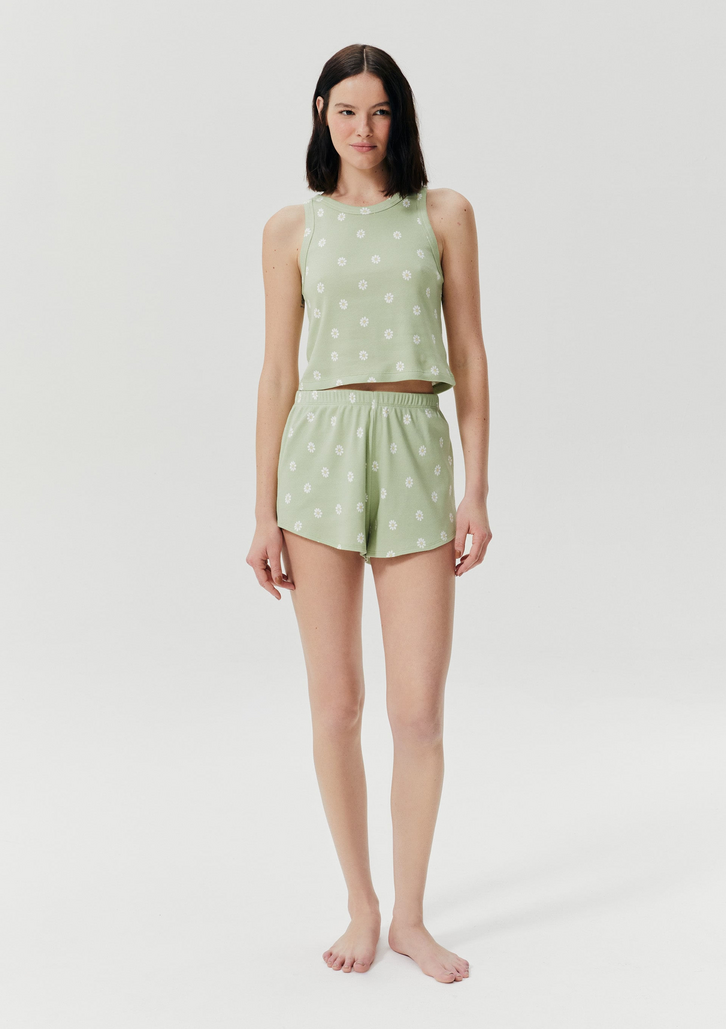 Pijama curto feminino estampado, elaborado em malha de ribana, que possui uma textura canelada e elástica. É durável e muito confortável, composto por uma regata nadador e um shorts com cós de elástico. Ambos se destacam pelo seu estampado romântico e delicado.O pijama canelado propõe um estilo mais funny, com mood jovial e divertido pelas suas cores alegres e vibrantes! Detalhes da regata:Em ribana Canelada Modelagem slim Costas nadador Alças largasDetalhes do shorts:Em ribana Canelada Modelagem reta Cintura alta Cós de elástico