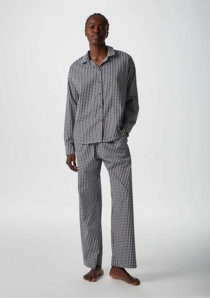 Conjunto de pijama elaborado em tricoline fio tinto, tecido plano 100% algodão, com uma padronagem clássica de vichy, um micro xadrez. Pijama composto por camisa manga longa, com gola resort, abertura de botões em toda vista frente e nos punhos, modelagem solta ao corpo e confortável. Calça em modelagem com shape reto e amplo, cós largo com elástico.Detalhes da peça:Tricoline fio tinto