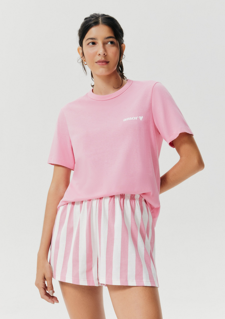 Conjunto de pijama manga curta com shorts que acompanha porta saquinho. Possui modelagem regular, camiseta com estampa localizada na frente com a escrita "self love club" que significa: clube do amor próprio. Já o shorts tem uma estampa rotativa de listras na vertical em duas cores. Faz parte da