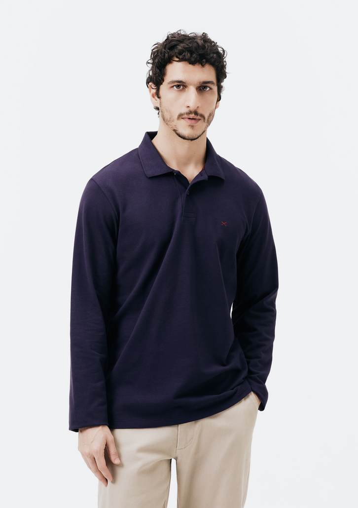 Polo piquet regular, solta ao corpo. Possui manga longa, gola colarinho com retilínea e friso contrastante. Detalhe de bordado de peixinhos Hering frontal.