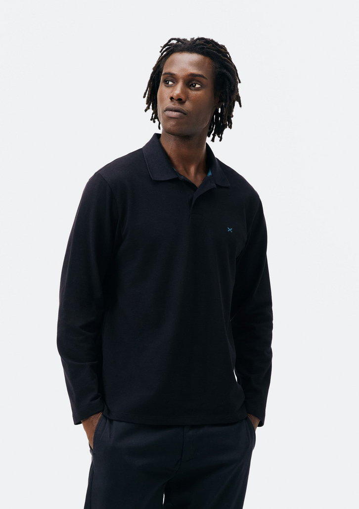 Polo piquet regular, solta ao corpo. Possui manga longa, gola colarinho com retilínea e friso contrastante. Detalhe de bordado de peixinhos Hering frontal.