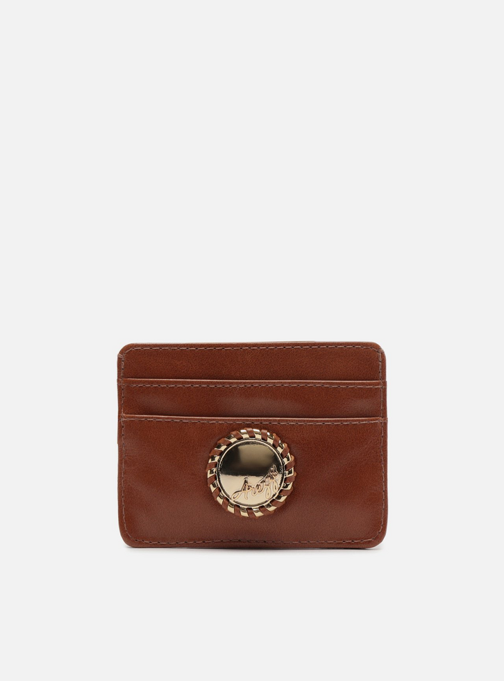 Porta-cartões feminino marrom em couro. O acessório tem formato retangular, contorno em pesponto e detalhe em peça metálica redonda na capa, com inscrição do nome da marca em cursiva e contorno em couro. Possui espaço para cartões na parte interna e na capa.
