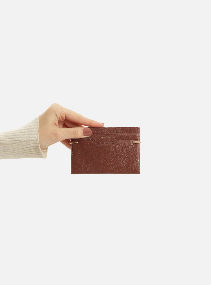Porta-cartões marrom de couro. O acessório tem capas texturizadas, formato quadrado e slim, contorno em costura pesponto e inscrição discreta do nome da marca na capa. Possui divisórias para cartões na parte frontal e interna. Com detalhe em metais nas laterais da parte superior e recorte geométrico central.