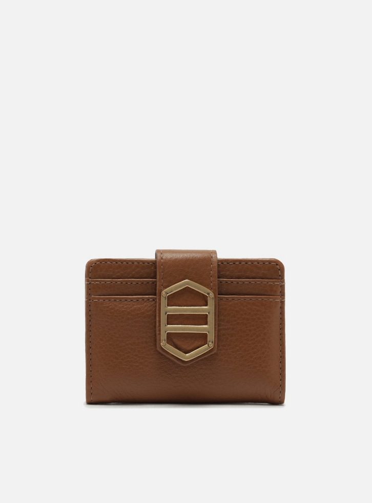 Porta-cartões feminino pequeno marrom de couro. O acessório tem formato quadrado e contorno em costura pesponto. Possui divisórias para cartões na capa frontal e tira vertical com aplicação de peça de metal geométrica.