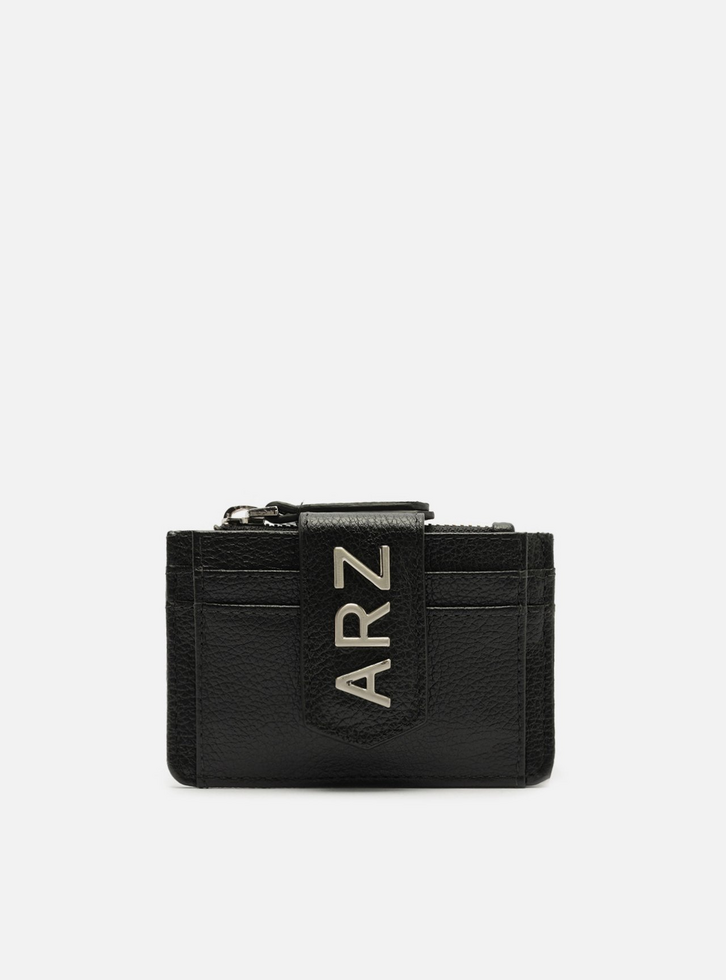 Porta-cartões preto de couro. O acessório tem capas texturizadas, formato quadrado e contorno em costura pesponto. Possui divisórias para cartões na capa frontal, bolso superior com zíper e puxador e tira vertical com aplicação das letras ARZ em metal.