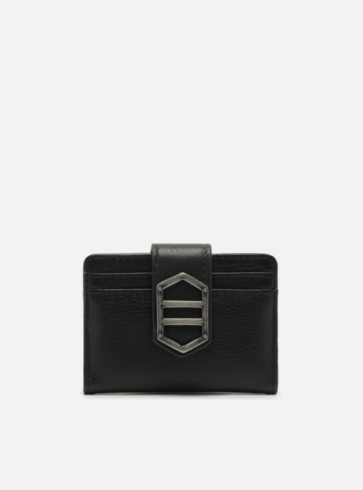 Porta-cartões feminino pequeno preto de couro. O acessório tem formato quadrado e contorno em costura pesponto. Possui divisórias para cartões na capa frontal e tira vertical com aplicação de peça de metal geométrica.