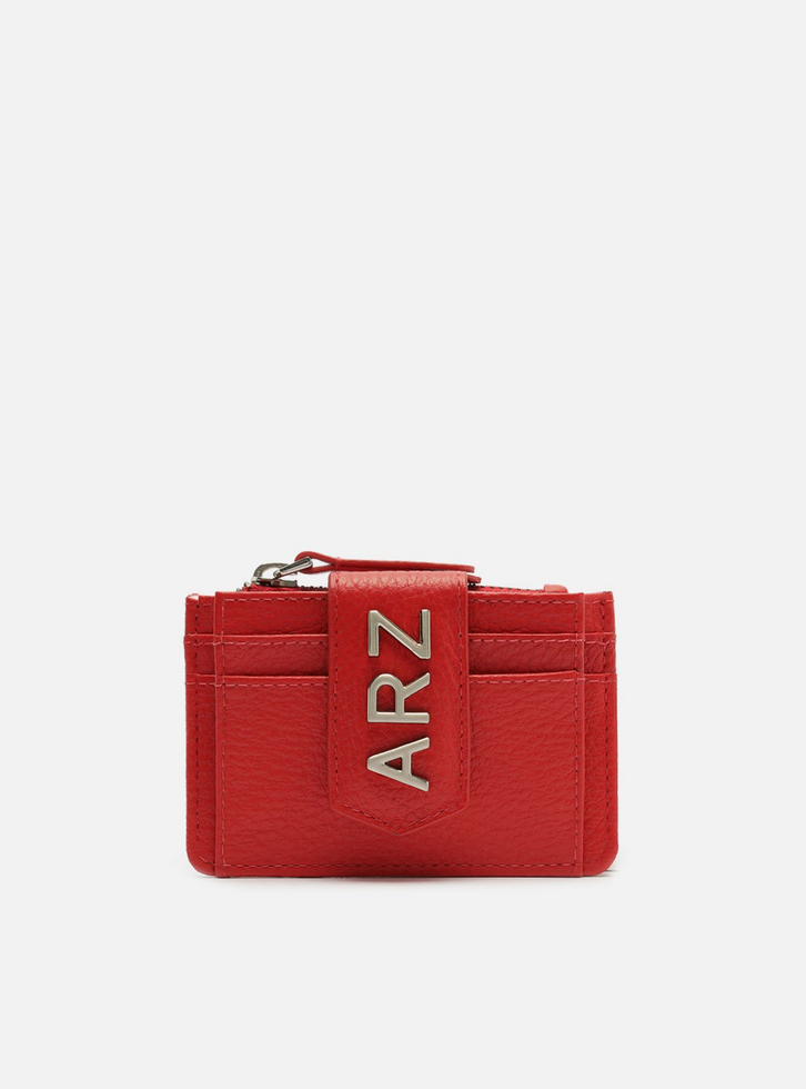 Porta-cartões vermelho de couro. O acessório tem capas texturizadas, formato quadrado e contorno em costura pesponto. Possui divisórias para cartões na capa frontal, bolso superior com zíper e puxador e tira vertical com aplicação das letras ARZ em metal.