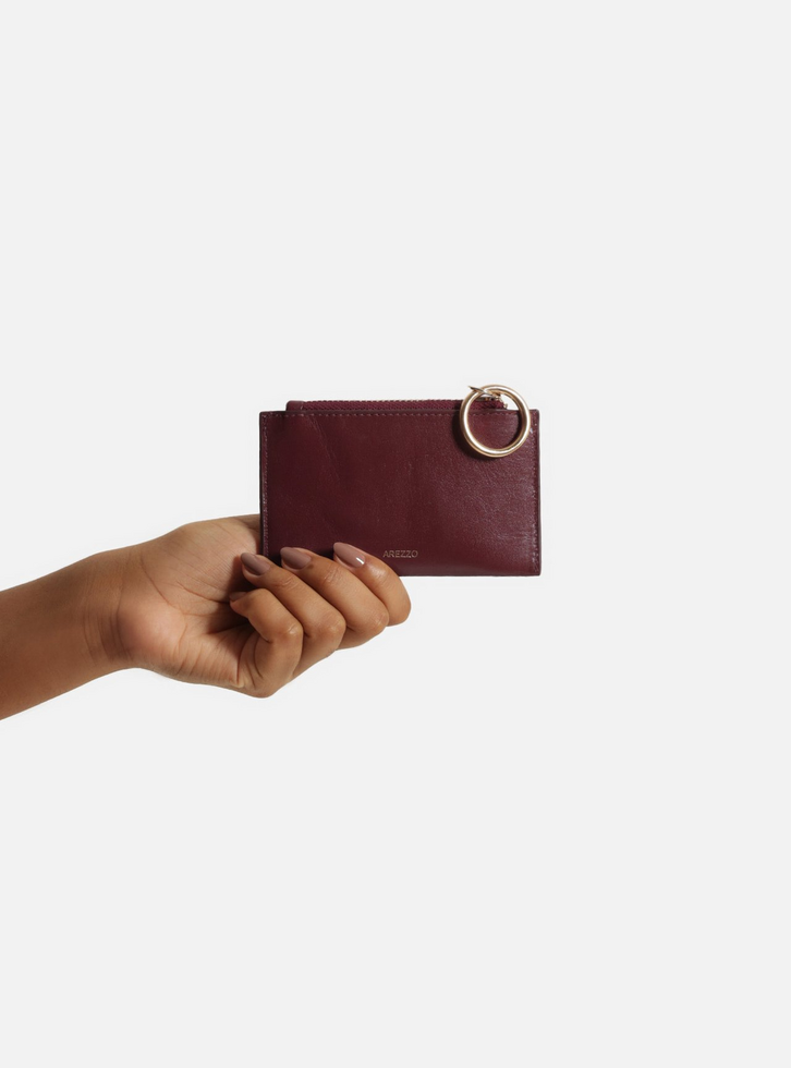Porta-cartões feminino pequeno vermelho de couro. O acessório tem formato retangular, bolso com fecho superior em zíper e puxador em metal orgânico dourado. Com nome da marca na capa e espaço para cartões interno.