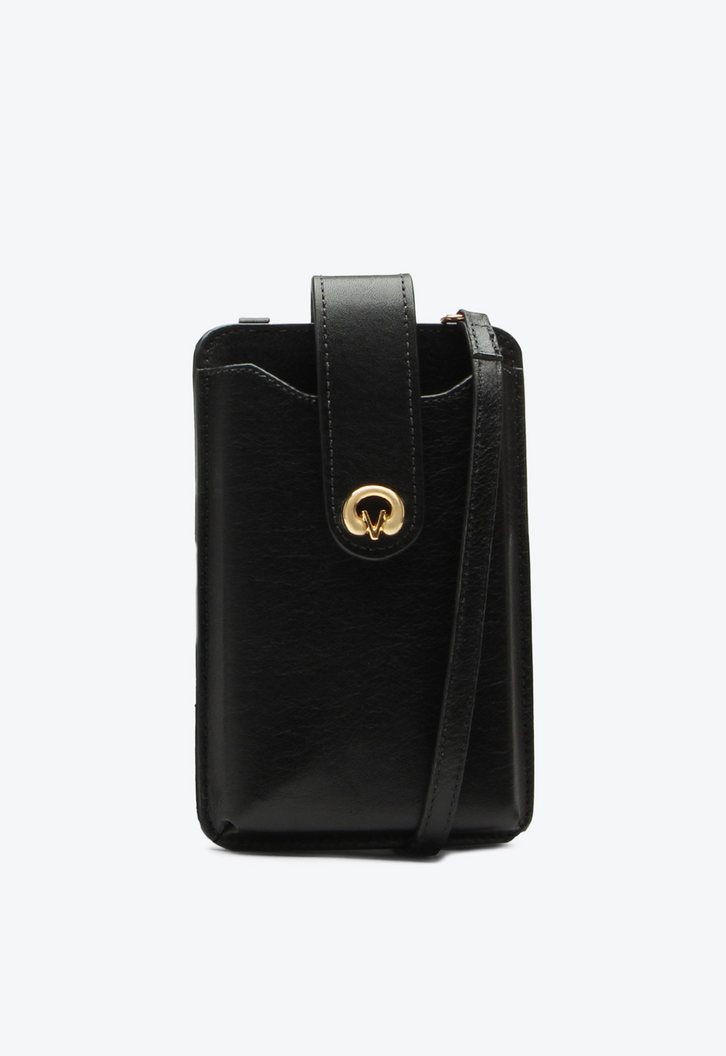 Capa de celular Mel em couro preto. Com fechamento em fivela e alça tiracolo, essa peça une praticidade e estilo no melhor do mood boho. Ideal para levar o celular com segurança, também conta com compartimento traseiro para cartões. Compacta, versátil e cheia de charme, é perfeita para complementar produções leves no dia a dia.