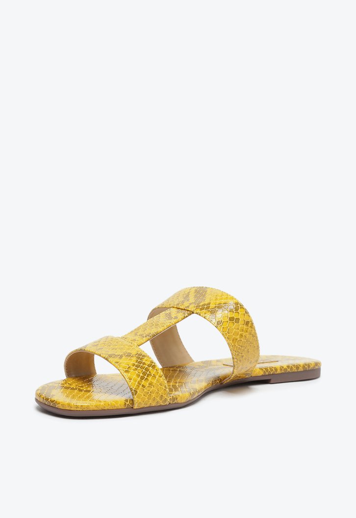 Sandália amarela aberta no calcanhar, com salto rasteiro e duas tiras que cruzam sobre o peito do pé unidas por uma tira vertical formando um H. Com textura de cobra. Deixa dedos e calcanhar à mostra.