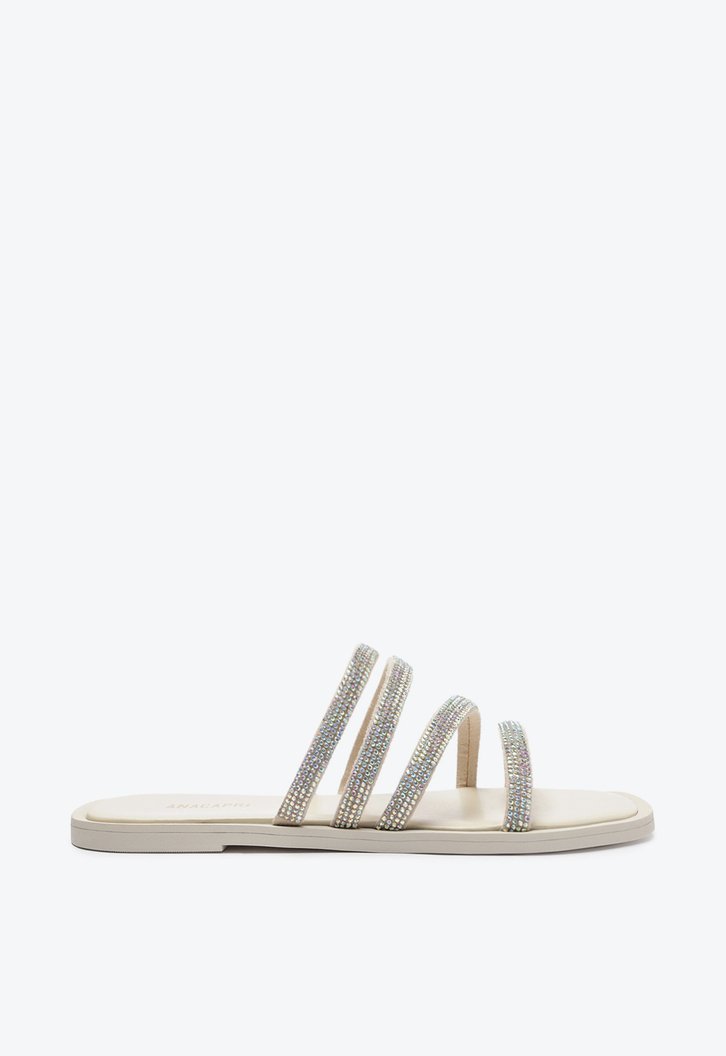 Sandália rasteira branca. O modelo tem sola flat e quatro tiras finas sobre os dedos e o peito do pé com aplicação de strass. De bico quadrado, é aberta e exibe todo o pé. Com palmilha nude e inscrição Anacapri.
