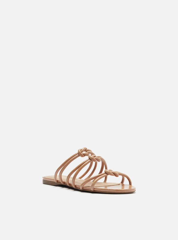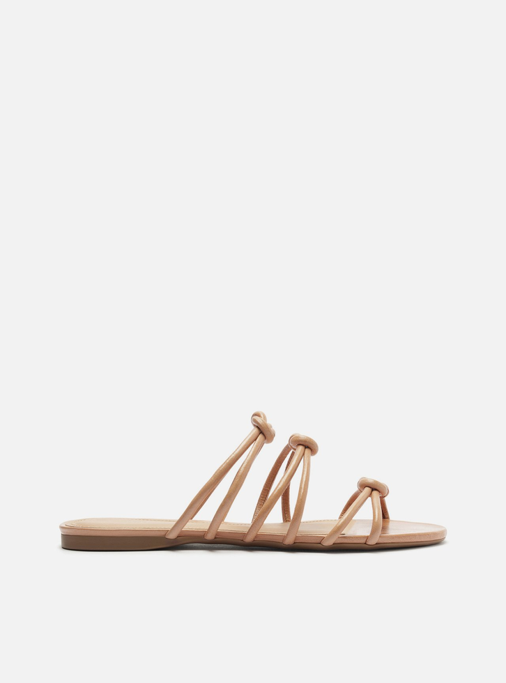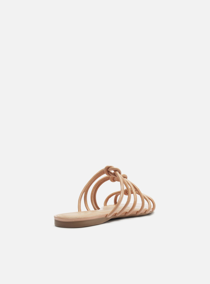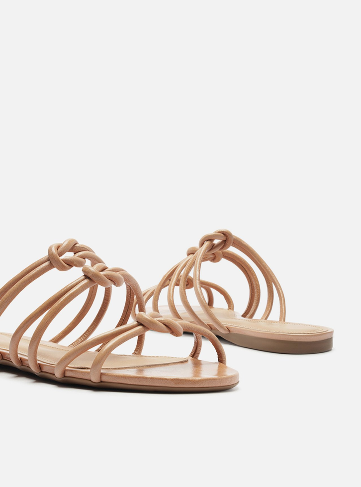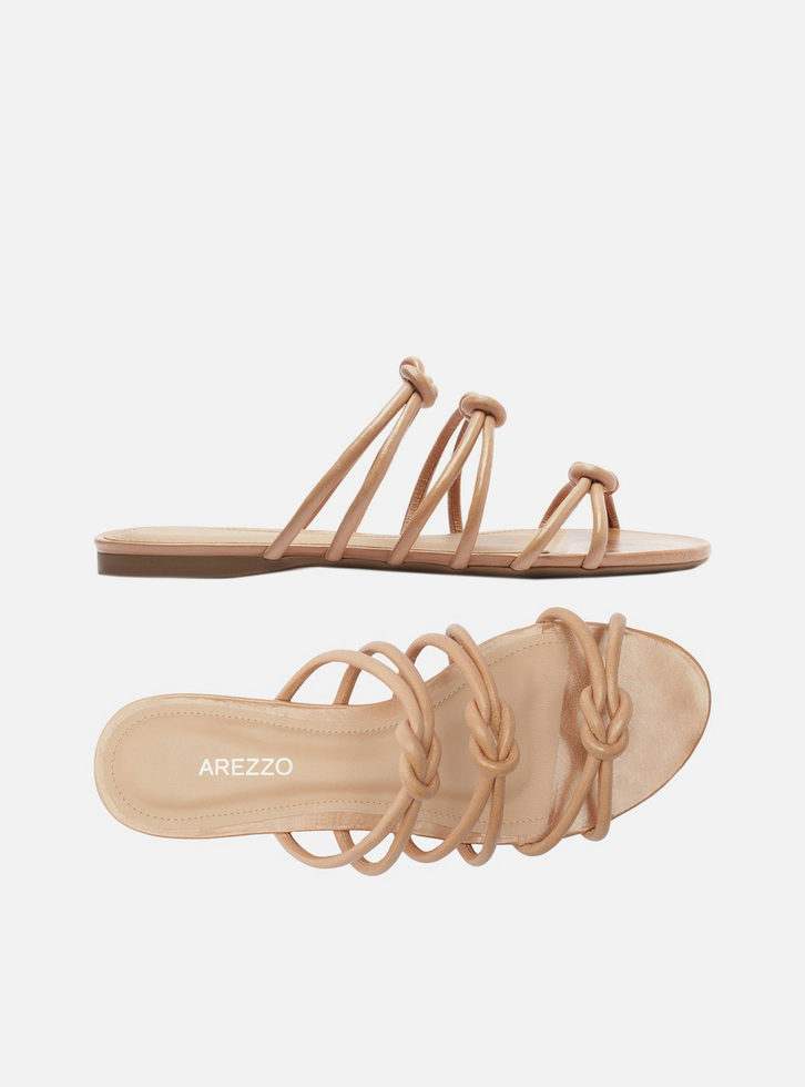 Sandália rasteira feminina bege. O sapato tem sola flat e três duplas de tiras finas e destacadas, unidas por um nó no centro, sobre os dedos e a parte superior do pé. Com ponta redonda, é aberta e exibe todo o pé. Com palmilha bege e inscrição do nome da marca.