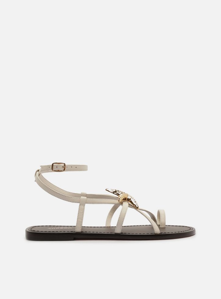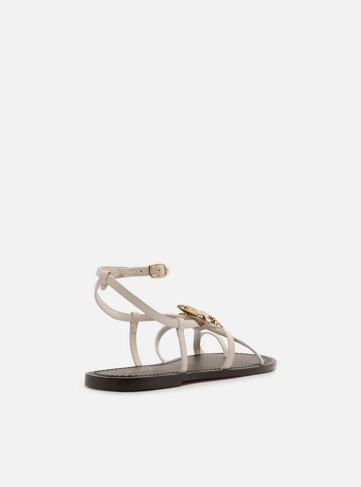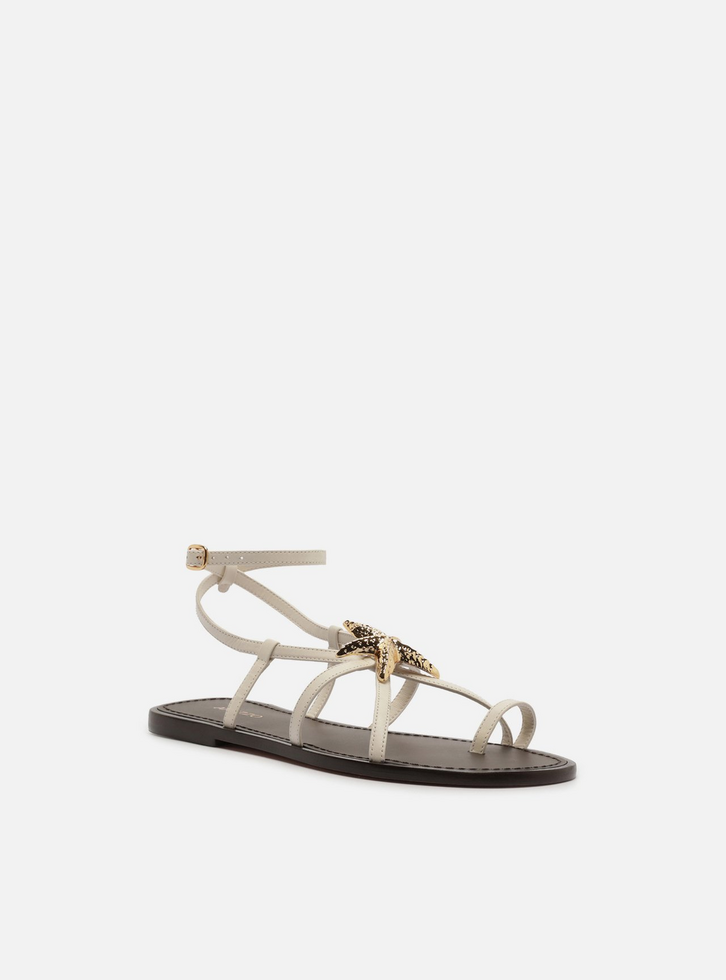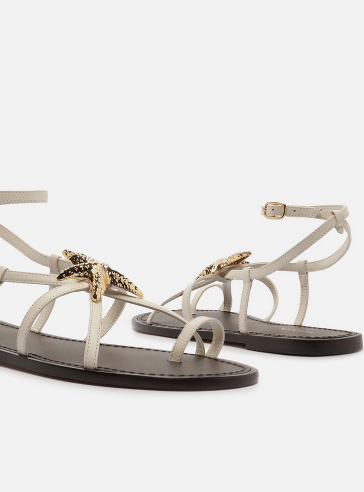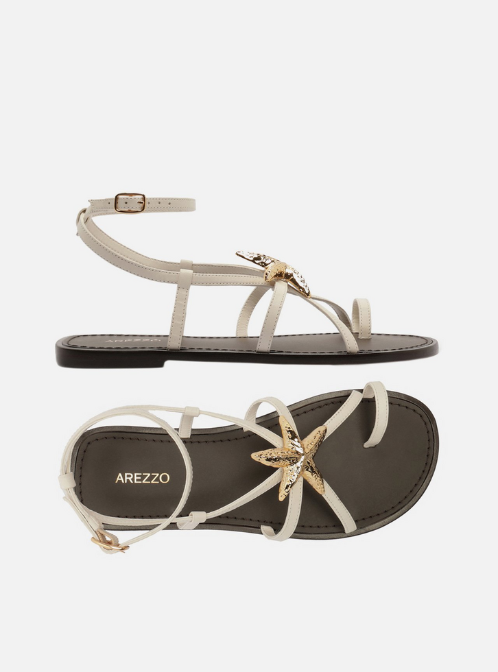 Sandália rasteira feminina branca de couro. O sapato tem salto rasteiro e formato arredondado na ponta. Traz tira fina na parte superior do pé, com aplicação de metal em forma de estrela-do-mar, e tira em torno do dedão. Possui mais duas tiras finas que saem das laterais frontais, cruzam na parte superior do pé, contornam o tornozelo e fecham em fivela lateral. Com palmilha lisa e nome da marca.