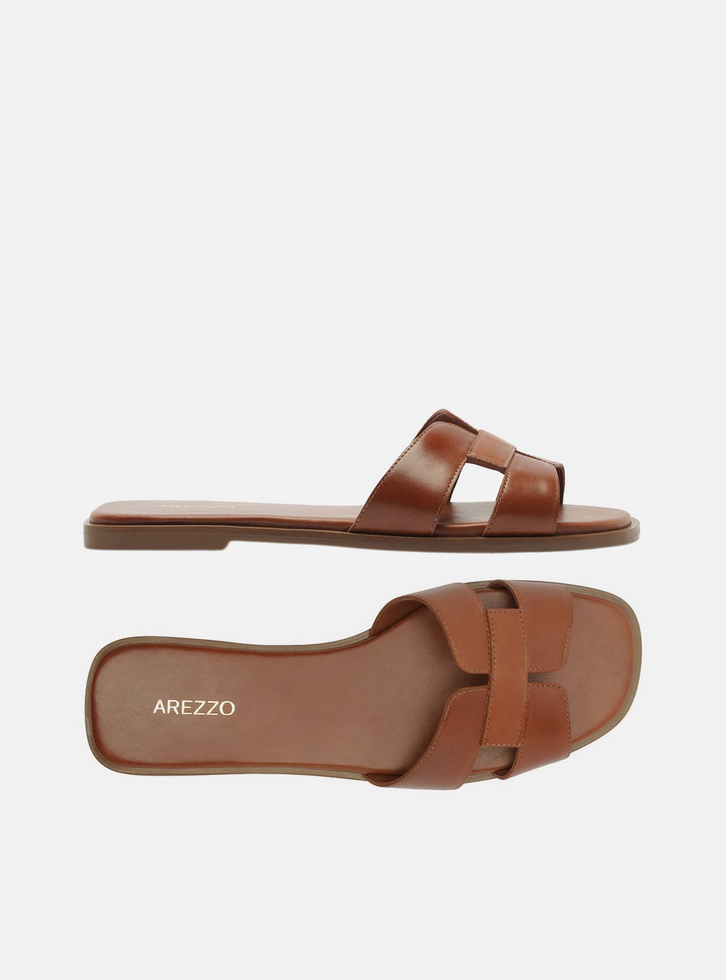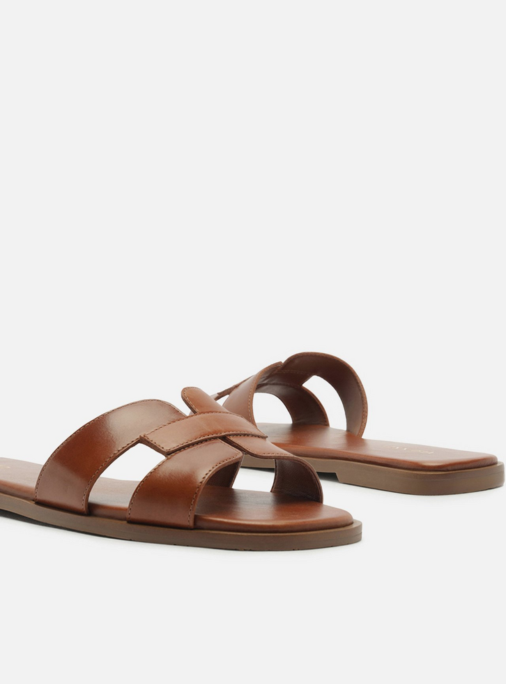 Rasteira marrom de couro. O sapato tem sola flat e formato quadrado na ponta. Traz cabedal em tira única e vazada, além de costuras pesponto por todo o contorno. Com palmilha da cor da rasteira e inscrição do nome da marca.
