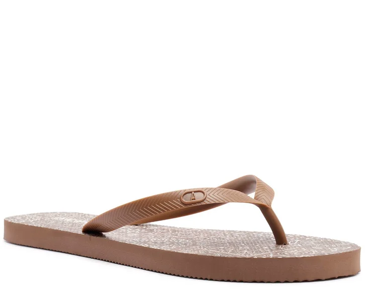 Chinelo de dedo, com detalhe estampado, na cor marrom. O modelo possui solado rasteiro emborrachado, com biqueira arredondada. Traz cabedal injetado em PVC - com tira central lisa, que passa entre os dedos e segue pelas laterais, com assinatura em cápsula em resina Anacapri. Possui palmilha comfy com estampa personalizada e assinatura Anacapri.