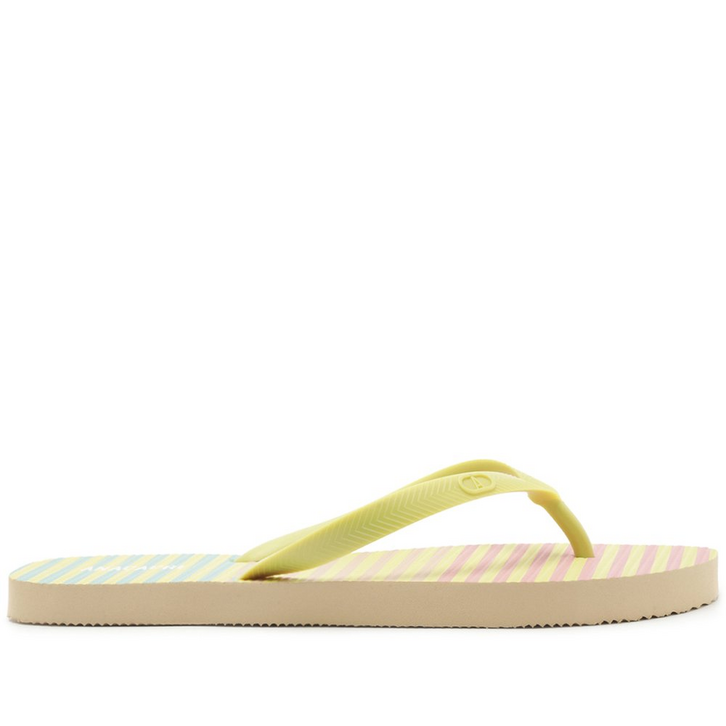 Chinelo de dedo emborrachado com estampa listrada em tons de amarelo, rosa e azul. O modelo possui solado flat emborrachado e biqueira arredondada. O cabedal traz tiras finas em amarelo dividindo os dedos. Em destaque, aplicação do logo da marca em alto-relevo (oval com a letra “A” no interior) em uma das tiras. A palmilha estampada listrada apresenta assinatura Anacapri.