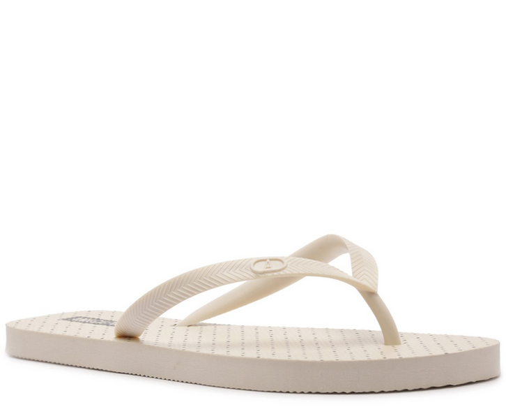 Chinelo de dedo emborrachado com estampa pontilha Branca. O modelo possui solado flat emborrachado e biqueira arredondada. O cabedal traz tiras finas em branco dividindo os dedos. Em destaque, aplicação do logo da marca em alto-relevo (oval com a letra "A" no interior) em uma das tiras. A palmilha estampada listrada apresenta assinatura Anacapri.