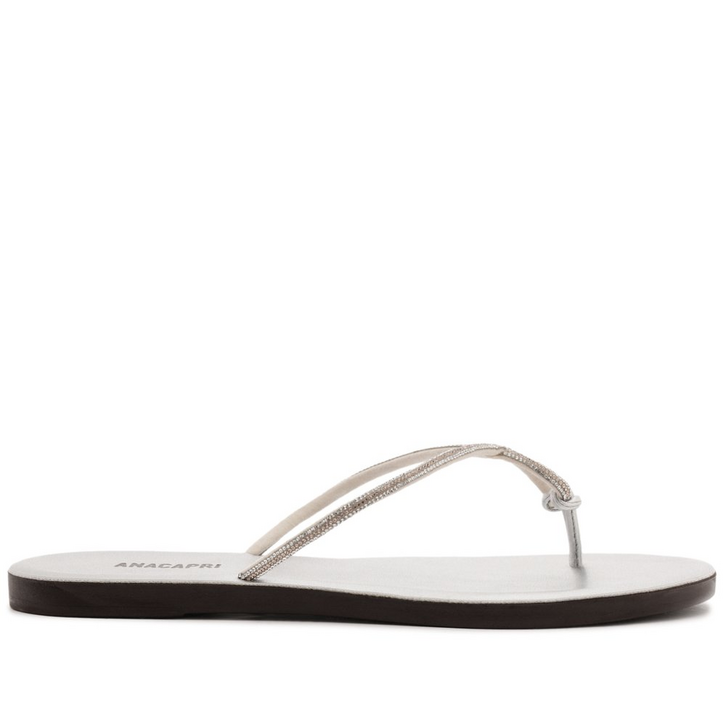 Rasteira de tiras tradicionais com efeito glam, na cor prateada. O modelo possui solado rasteiro emborrachado e biqueira arredondada. Traz cabedal com tira central em rolotê com aplicação de strass que passa entre os dedos e cruza pelo peito do pé, com arremate vazado na parte superior da gáspea. Com palmilha comfy e assinatura Anacapri.
