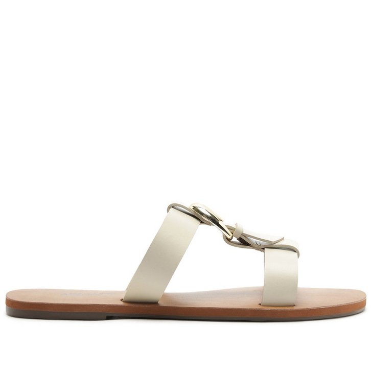 Rasteira com detalhe em fivela, na cor branca. O modelo com shape slim possui sola rasteira flat emborrachada, com leve saltinho traseiro. Com biqueira arredondada, traz cabedal com design imponente com uma tira média sobre os dedos, conectada na tira central por maxi fivela metálica, que se une à tira sobre o peito do pé. Aberta atrás, apresenta palmilha nude, com assinatura Anacapri.